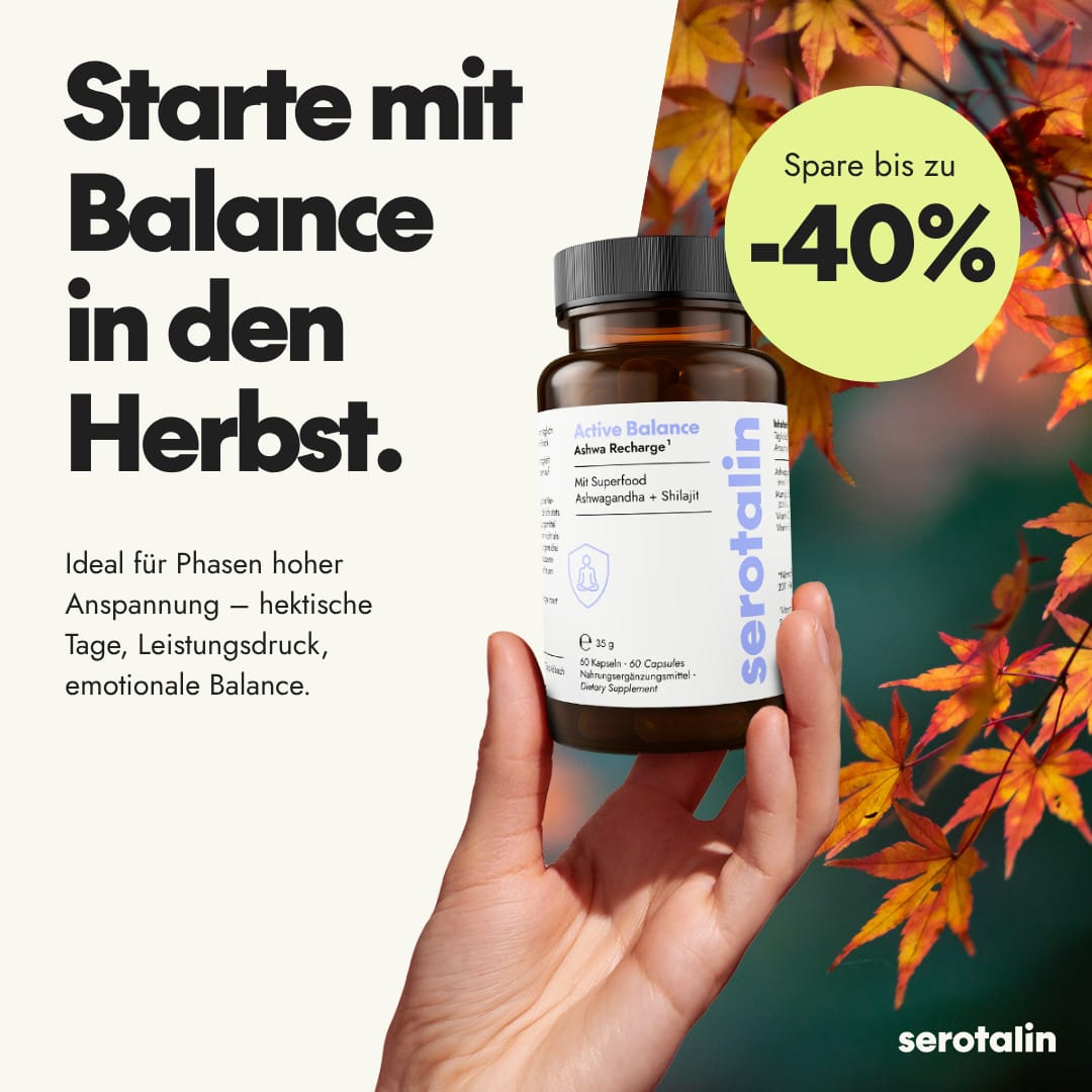 Herbst-Stress? 🌿 Bei serotalin gibt’s jetzt 40% Rabatt auf Active Balance Ashwa Recharge¹ – für mehr Ruhe & innere Balance!