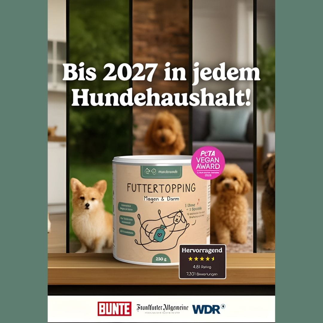 Hunderunde hat die Lösung für sensible Hundemägen: Ein Futtertopping, das Verdauungsprobleme natürlich ausgleicht – ohne Futterumstellung!