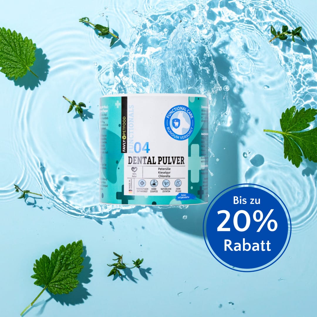 Das FAVLY DENTAL-Pulver unterstützt die Zahnpflege Deines Hundes effektiv und natürlich - einfach ins Futter mischen für gesunde Zähne und frischen Atem!