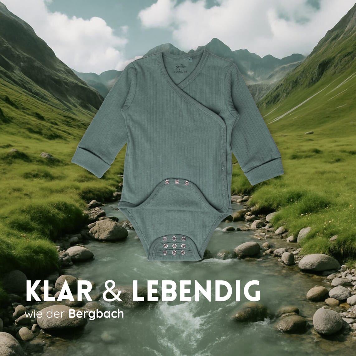 Der neue Bio Babybody von BerBiber in Bergbach Grün bringt Farbe, Leichtigkeit und Natürlichkeit - perfekt für kleine Entdecker!