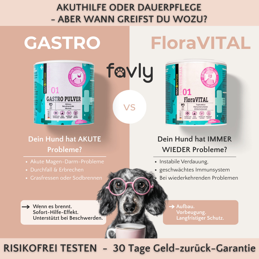 Mit GASTRO und FloraVITAL bietet FAVLY zwei natürliche Pulver – für akute Magen-Darm-Beschwerden und den langfristigen Darmaufbau beim Hund! 🐾