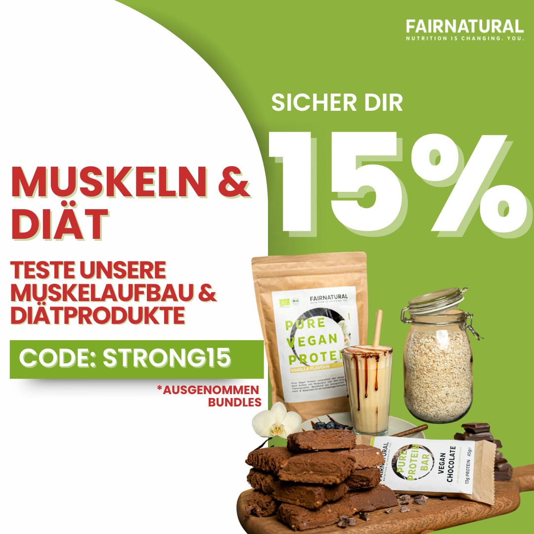 Starte fokussiert in deine Woche - mit 15% Rabatt auf alle Muskelaufbau- & Diätprodukte von Fairnatural! 💪