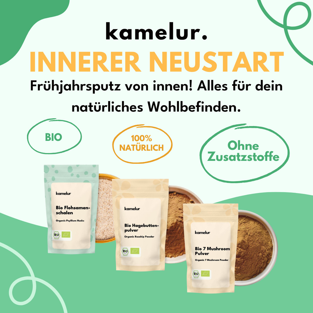 Bei Kamelur findest du dafür genau die richtigen Bio-Zutaten, die dich ganz natürlich und sanft dabei begleiten. Statt zu fragwürdigen, stark verarbeiteten Kuren zu greifen, bietet sich ein richtig spannendes Natur-Trio für deine morgendliche Routine an: Bio-Flohsamenschalen, feines Hagebuttenpulver und eine 7-Mushroom-Vitalpilzmischung!