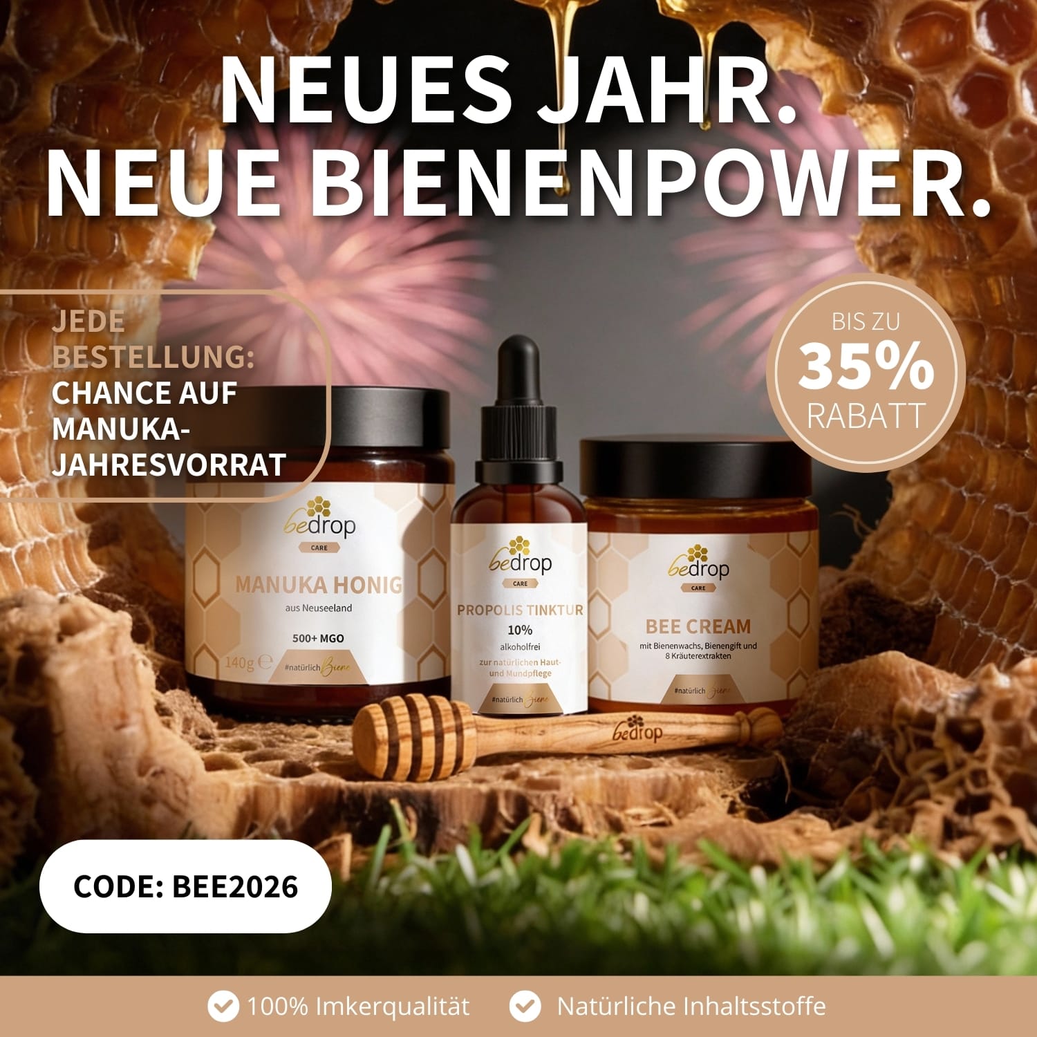 Bee ready for 2026! bedrop startet den Neujahrs-Sale mit bis zu 35 % Rabatt und inklusive der Chance auf einen Jahresvorrat Manuka Honig! 🍯