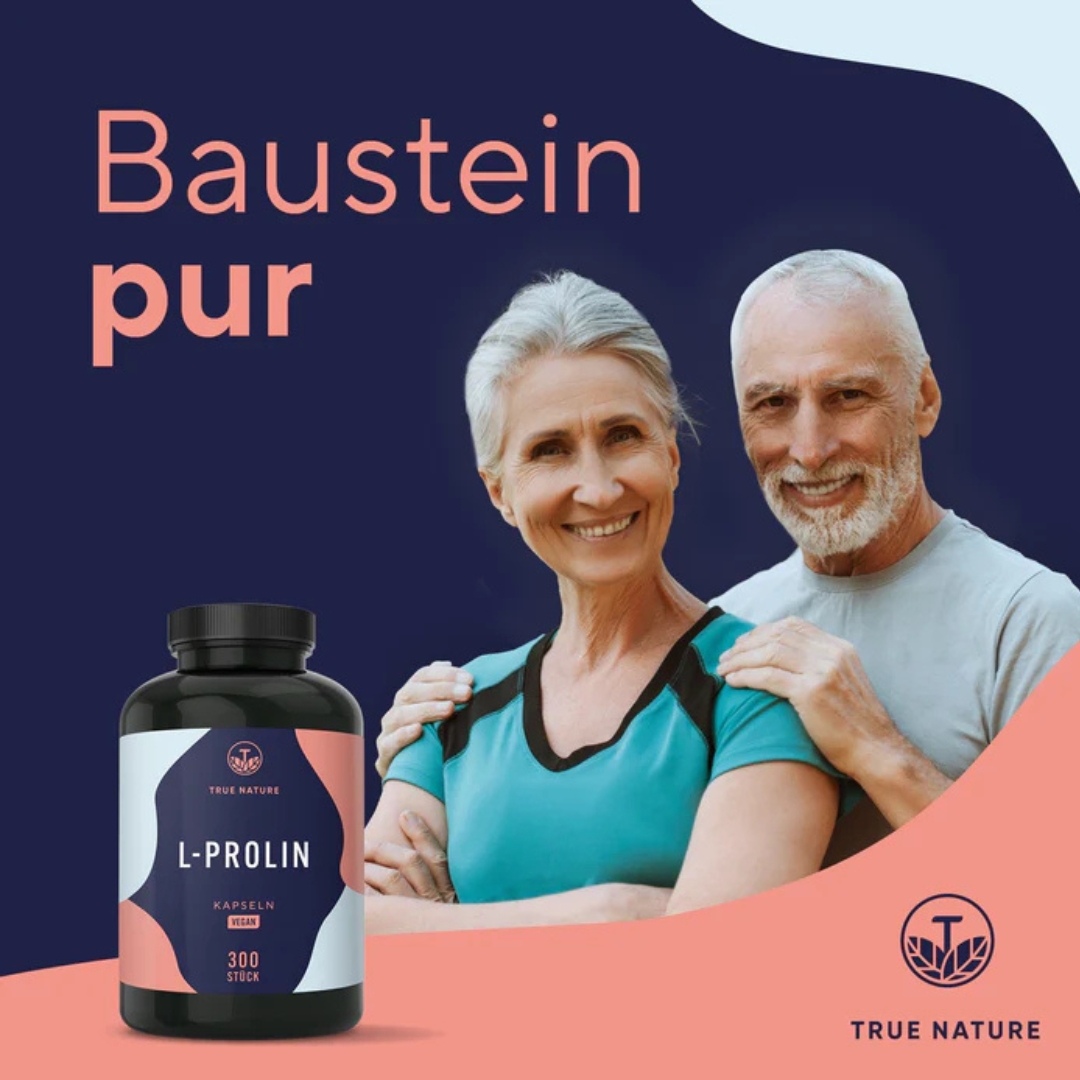 True Nature’s L-Proline capsules give your body a key amino acid building block for natural collagen synthesis. With 1,500 mg of L-Proline per daily dose, they specifically support connective tissue structure – vegan, high-dose, and free from unnecessary additives!