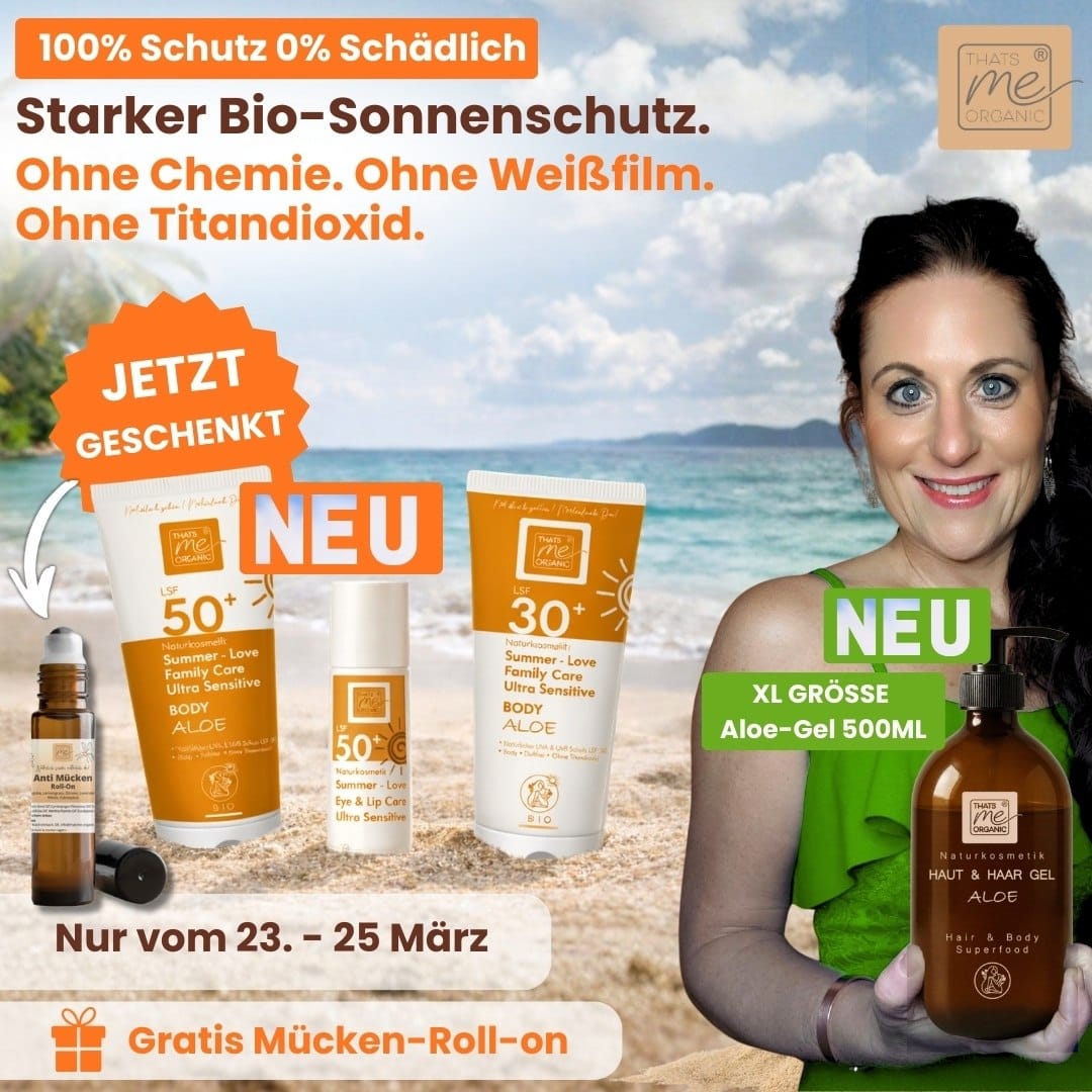 🎉 From March 23 to March 25, 4 new XL organic sun care products await you at Thats me organic – including an anti-mosquito roll-on as a free launch gift!