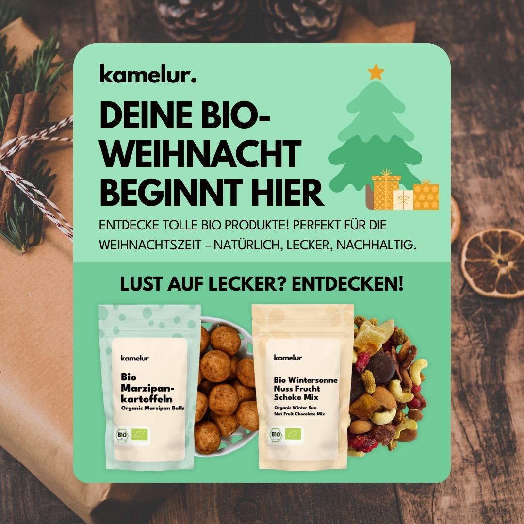 Kamelur’s Organic Christmas World: everything for the holiday season – from basic ingredients to seasonal classics. Many products are filled in-house and come in resealable pouches. Perfect for baking days, cozy evenings, and thoughtful gifts!