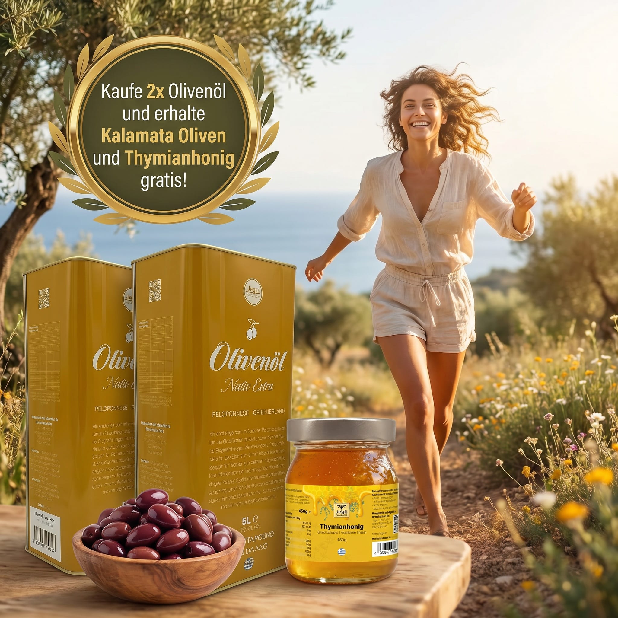Now at Jegit – when you purchase 2x 5 liters of olive oil, you’ll receive aromatic Kalamata olives and premium thyme honey absolutely free!