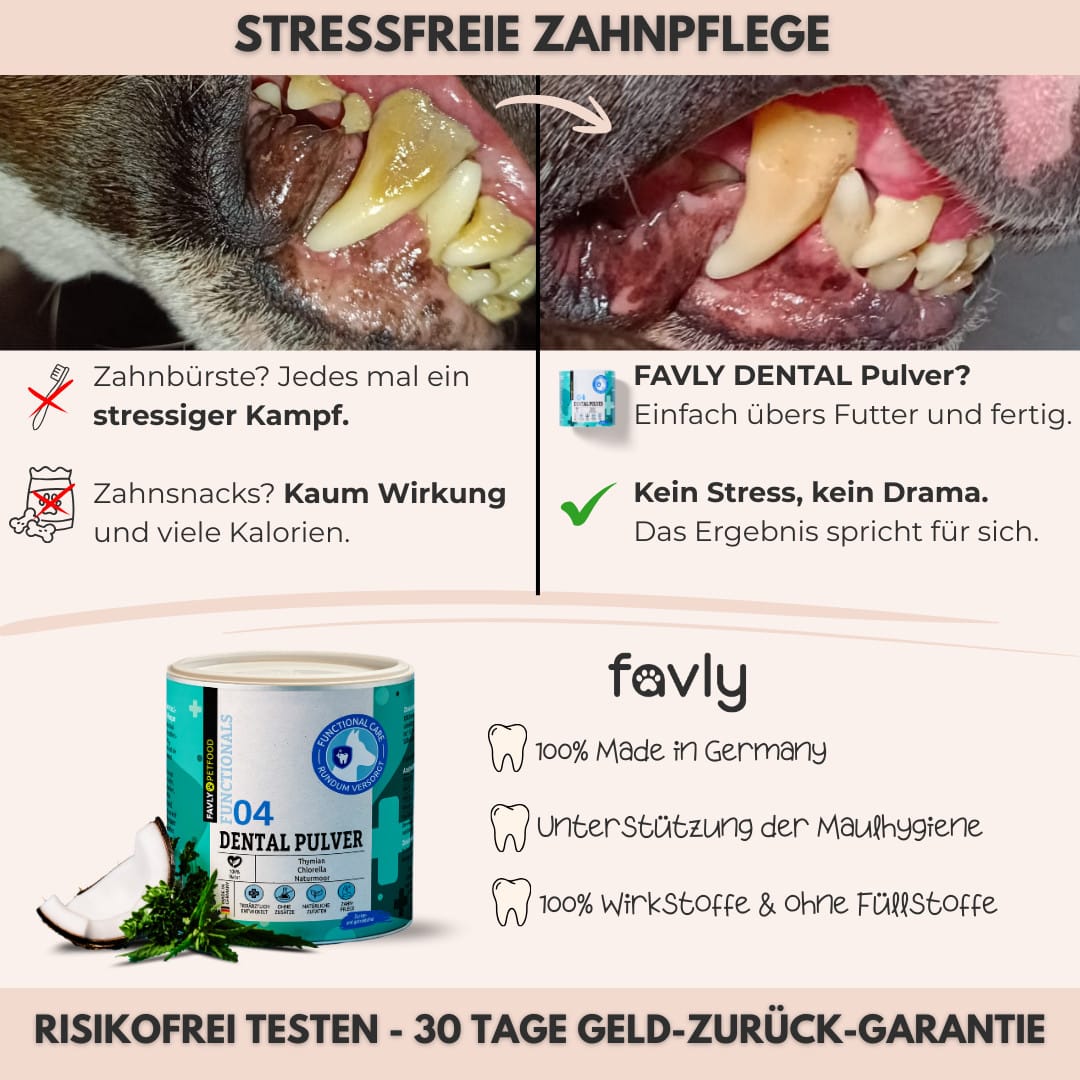 FAVLY finally makes dental care for dogs stress-free – no brushing needed, just add it to their food!