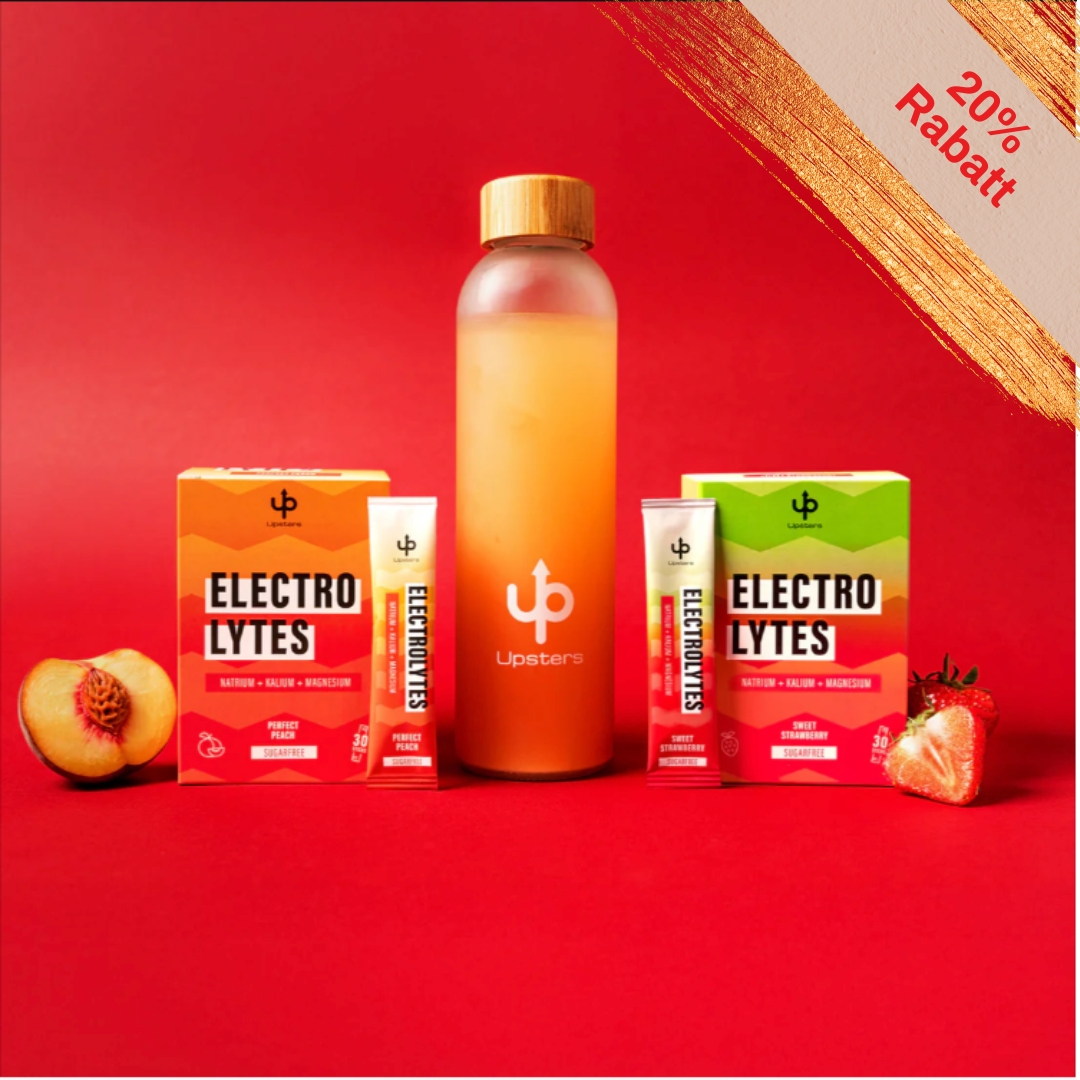 The Electrolytes Bundle from Upsters Energy® supports your daily hydration – with two sugar-free flavors (Perfect Peach & Sweet Strawberry) and a practical glass bottle that reminds you to drink.