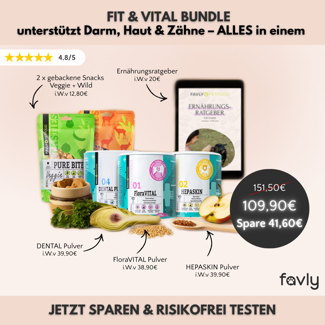 With the Fit & Vital Bundle from Favly, you’re choosing a natural solution that supports your dog’s gut, skin, and teeth – all at once! 🐾