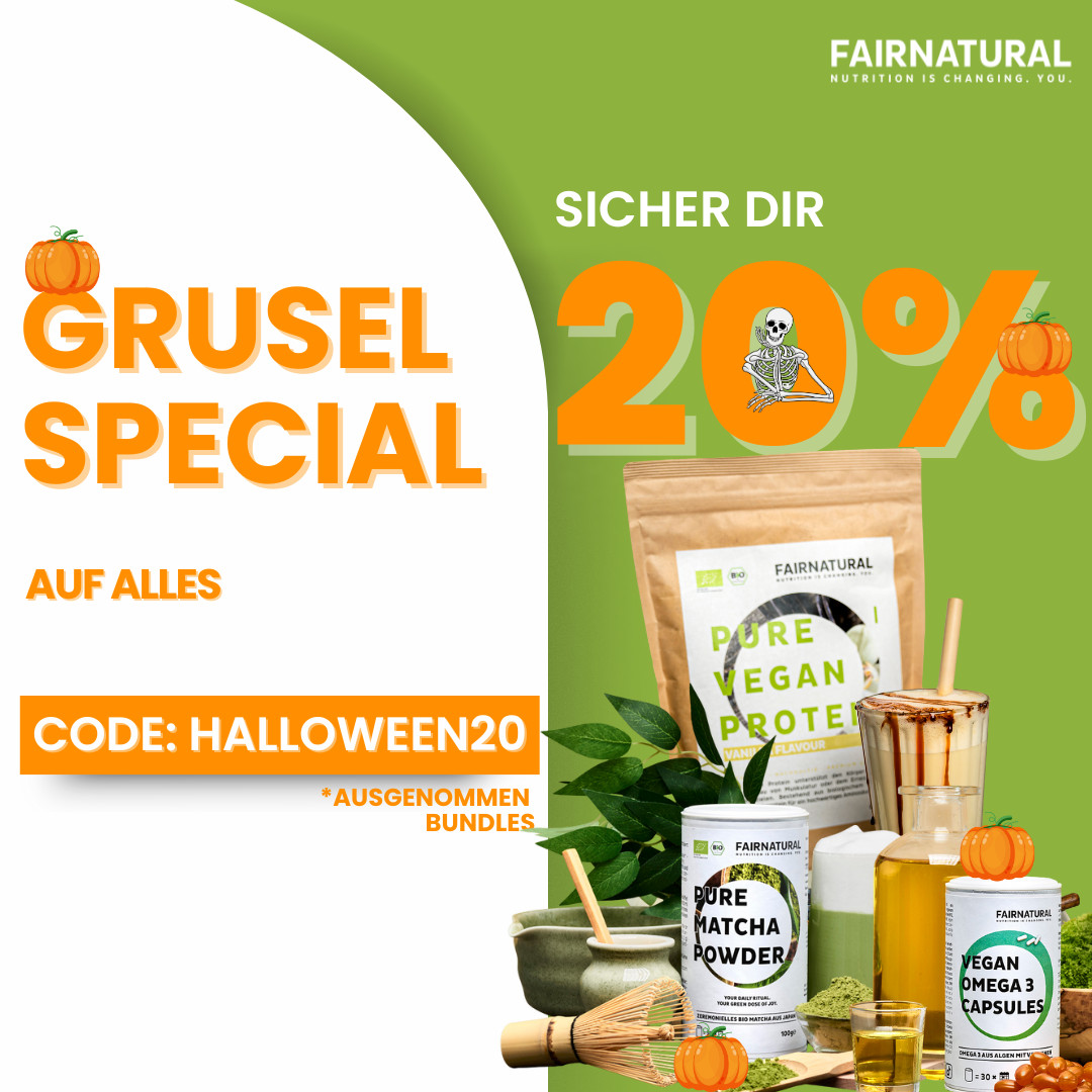 Save frightfully well & enjoy naturally 🌿✨ Whether it’s protein powder, superfoods, or vital nutrients – the Spooky Special gives you everything you need to feel strong, fit, and happy, now with 20% off! No magic tricks, just pure Fairnatural power! 💪