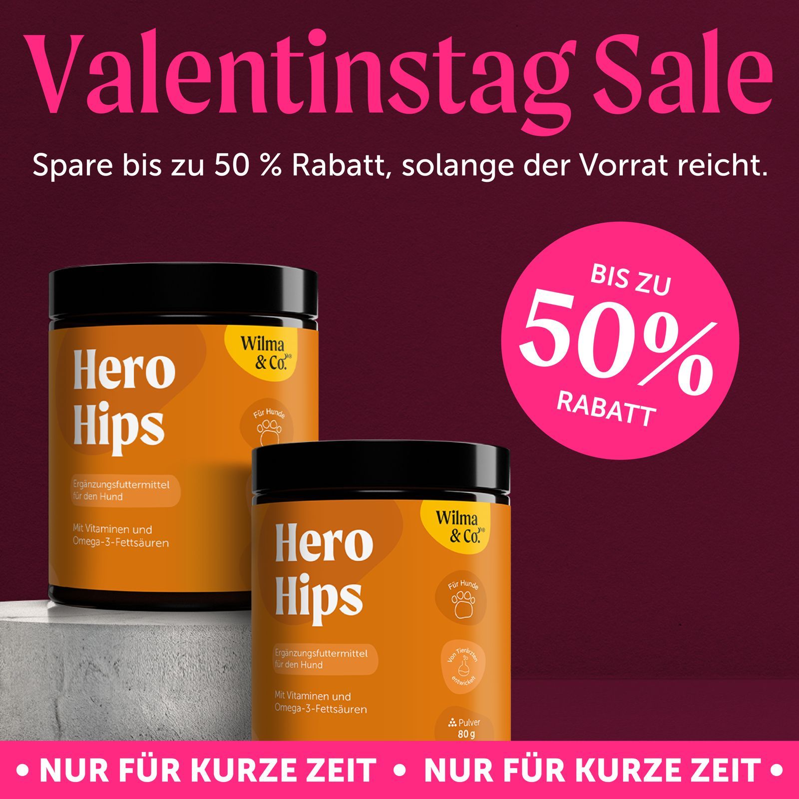 For healthy dog joints: HERO HIPS by Wilma & Co. in the Valentine’s Day special offer! Save up to 50% with the 3-pack bundle!