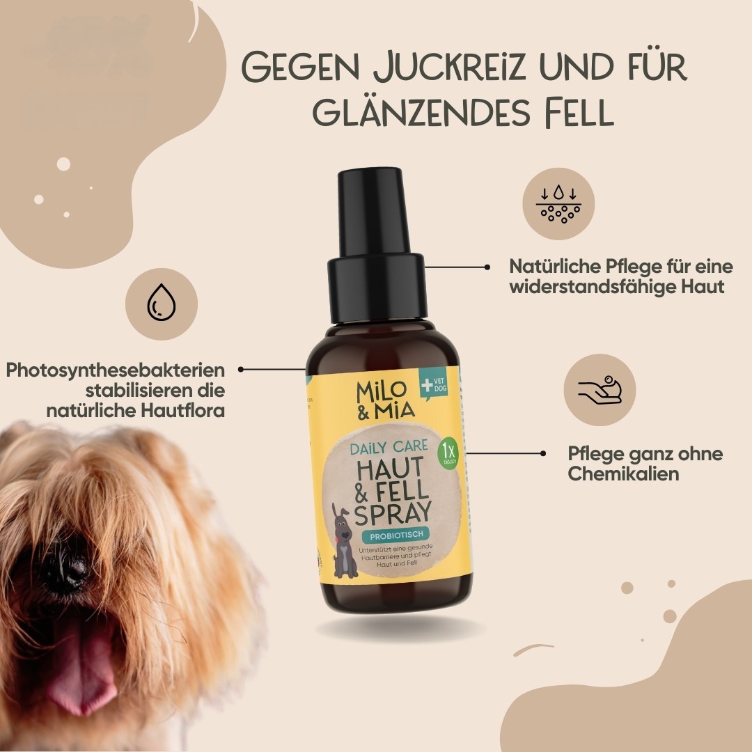 The Milo & Mia Skin & Coat Spray helps relieve your dog’s itchiness and brings out a visibly healthier coat! 🌿