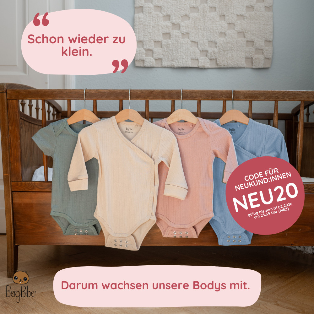 Your first purchase at BergBiber comes with a special treat: 20% off cozy organic baby bodysuits! Only until Feb 1st! 👶