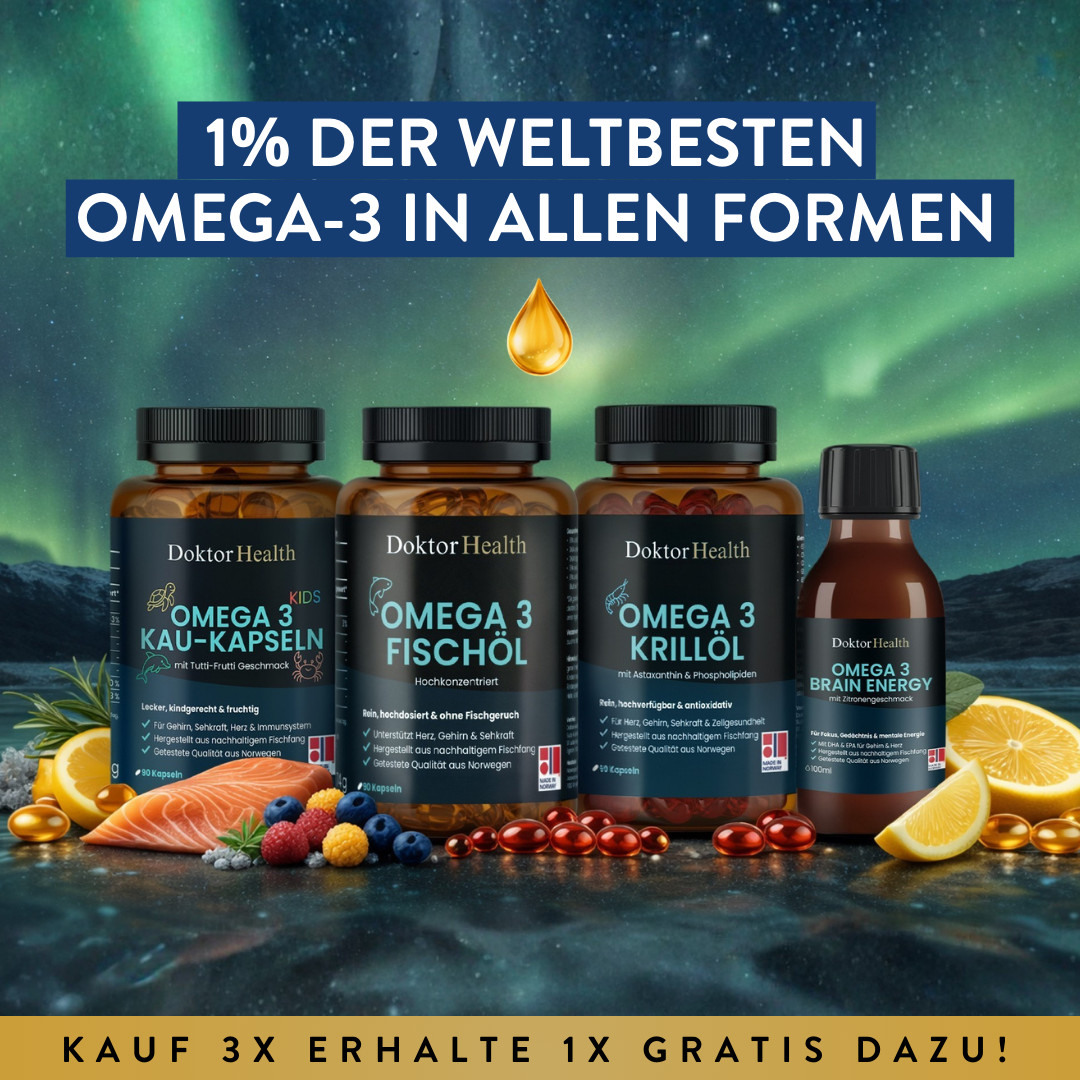 Whether it’s highly bioavailable krill oil, classic fish oil, convenient chewable capsules for kids, or Brain Energy in liquid form – Doktor Health has the perfect solution for your daily Omega-3 support!