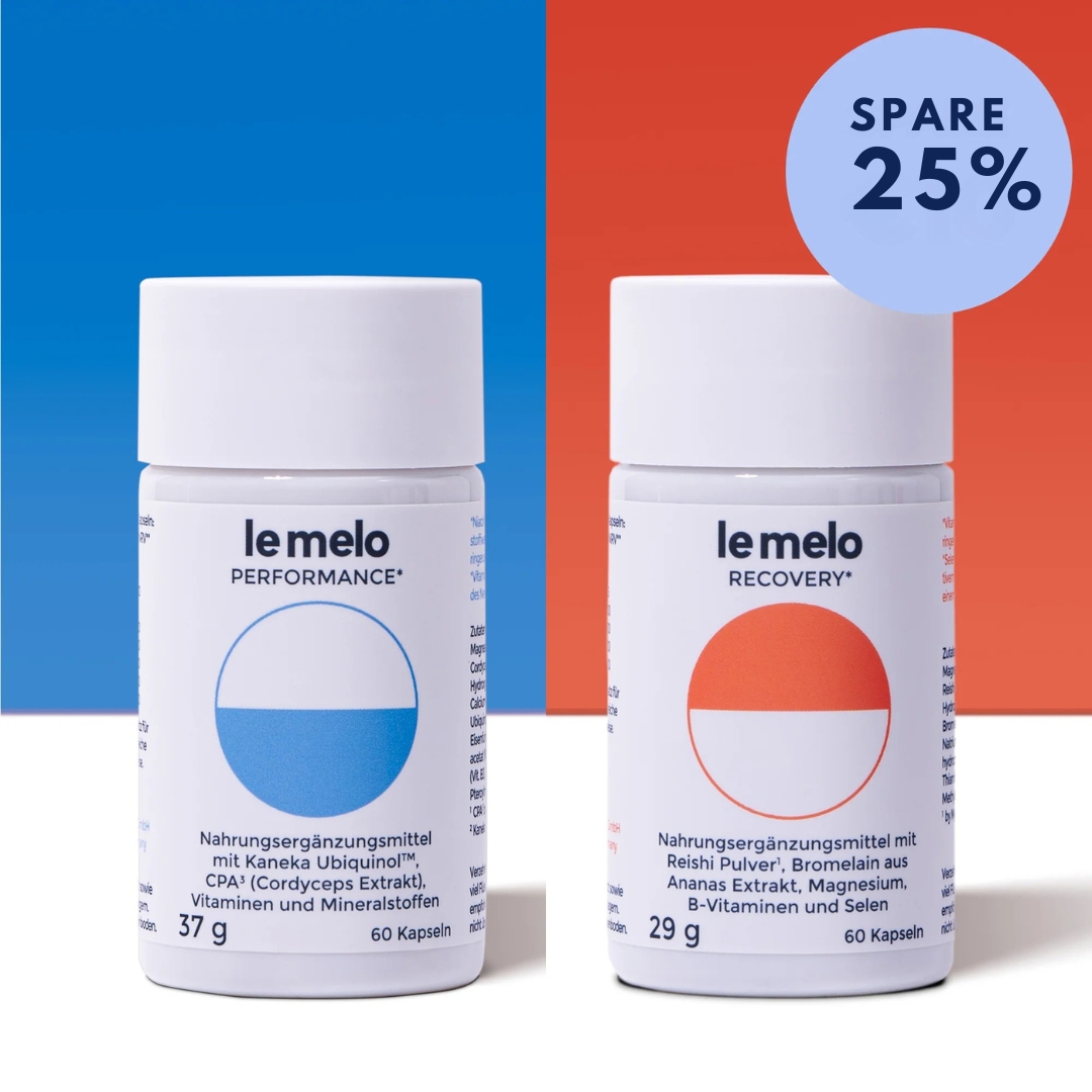 The Performance & Recovery Bundle from le melo combines two carefully formulated medicinal mushroom blends for daily use: Performance+ contains Cordyceps and Ubiquinol, Recovery+ combines Reishi with Bromelain and Magnesium. Developed as a supplement for people who want to approach their everyday life more consciously!